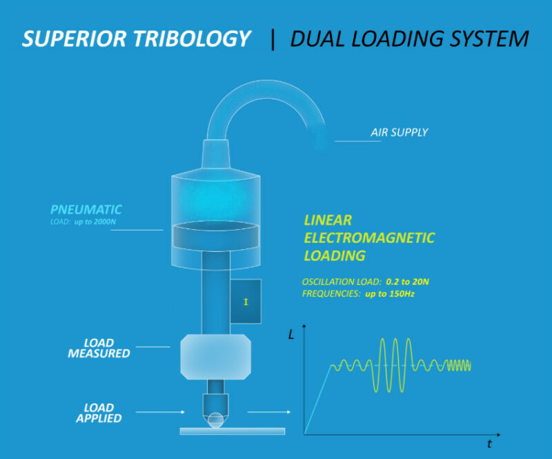 In addition a second linear stage can be used to apply a second oscillating load to simulate fluctuation of the overall load at frequencies up to 150Hz. This allows users to recreate real life applications where loads are not necessarily constant.